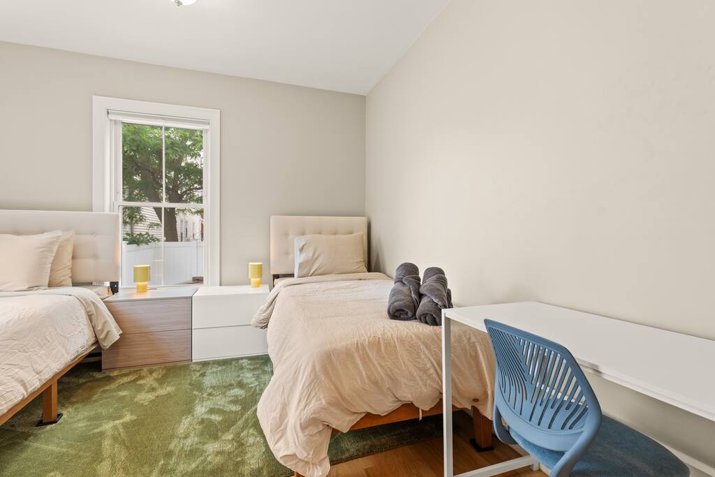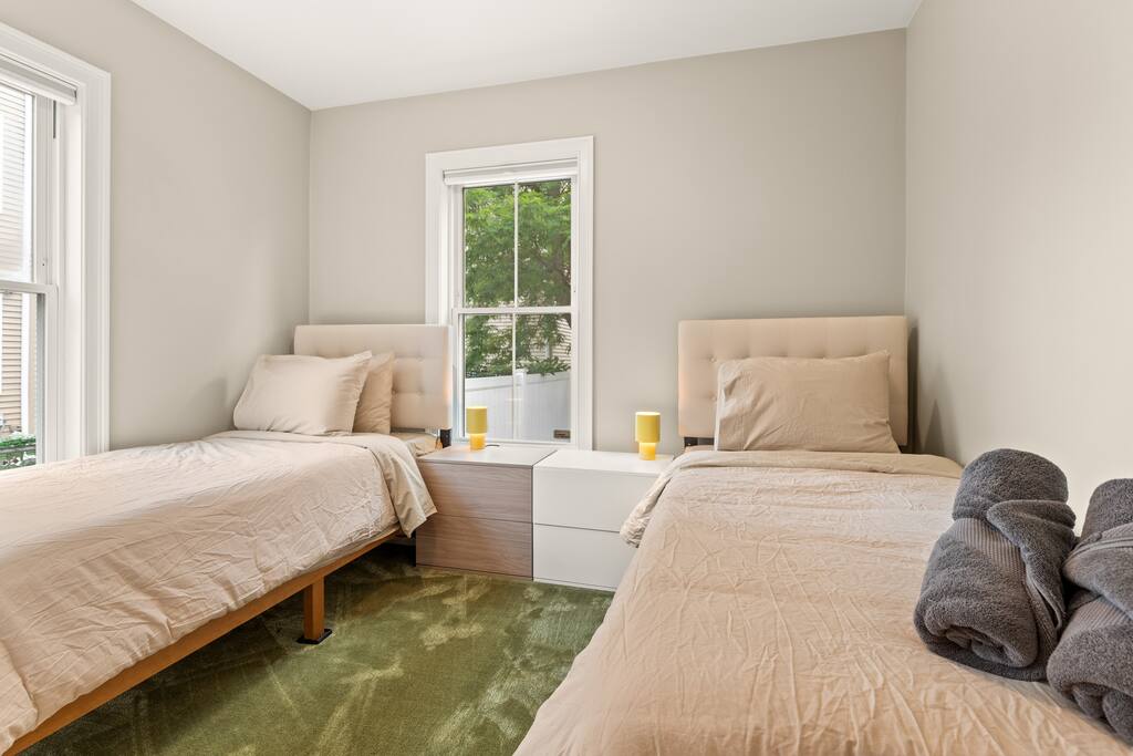 2bd (1 Queen, 2 Twin XLs, additional Twin XL-sized air mattress available), 1ba (includes shower and bath tub). Fully stocked kitchen with dining area. Cozy living room. Modern window A/C units in each bedroom and living room (installed May-September).
